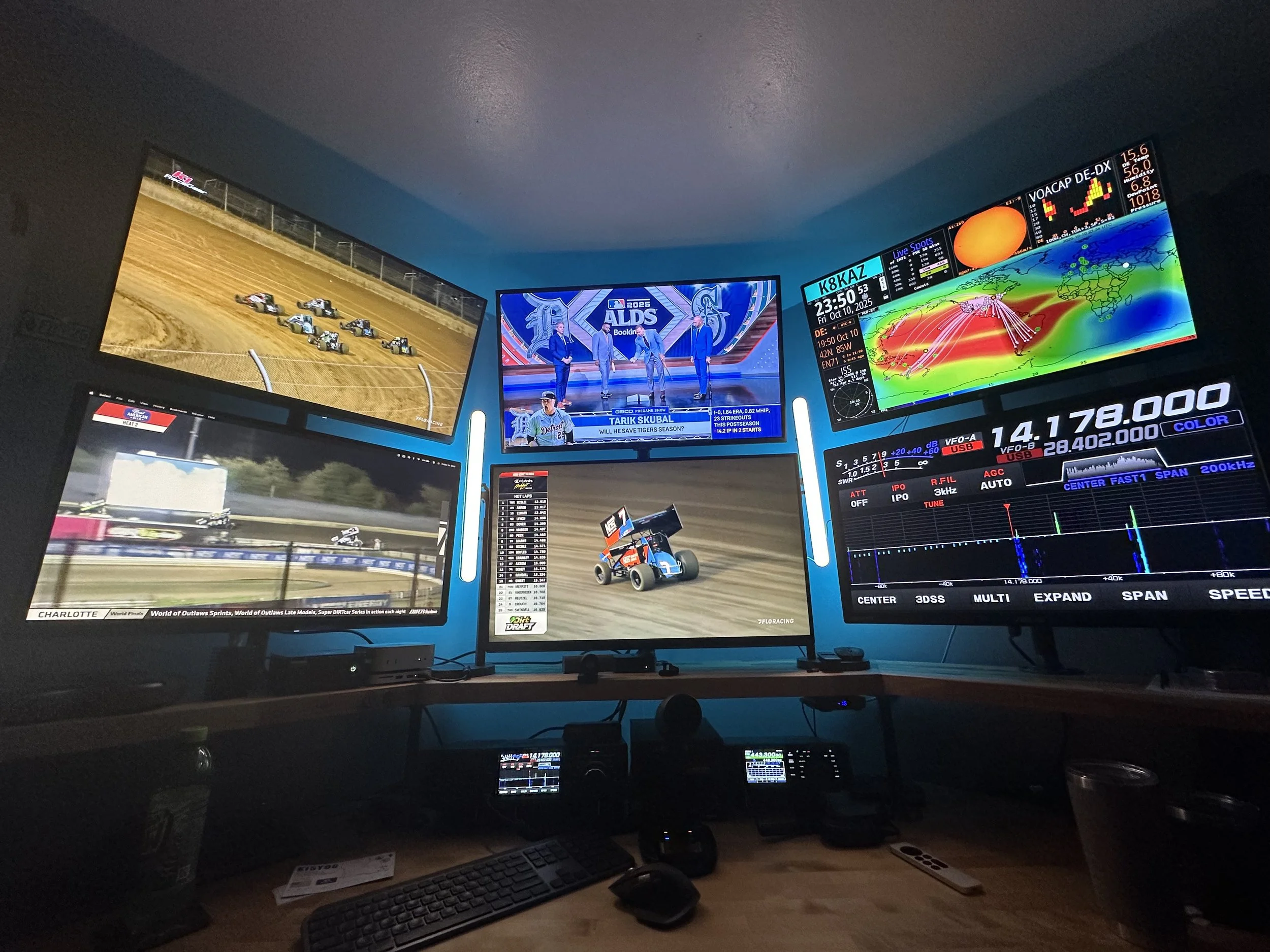 Center 2 screens are a 32” TV with a w/appleTV4k and a 32” for the Mac mini; left 2 monitors are for the Windows mini pc and MacBook Pro; right 2 screens are for the FTDX-10 and HamClock.