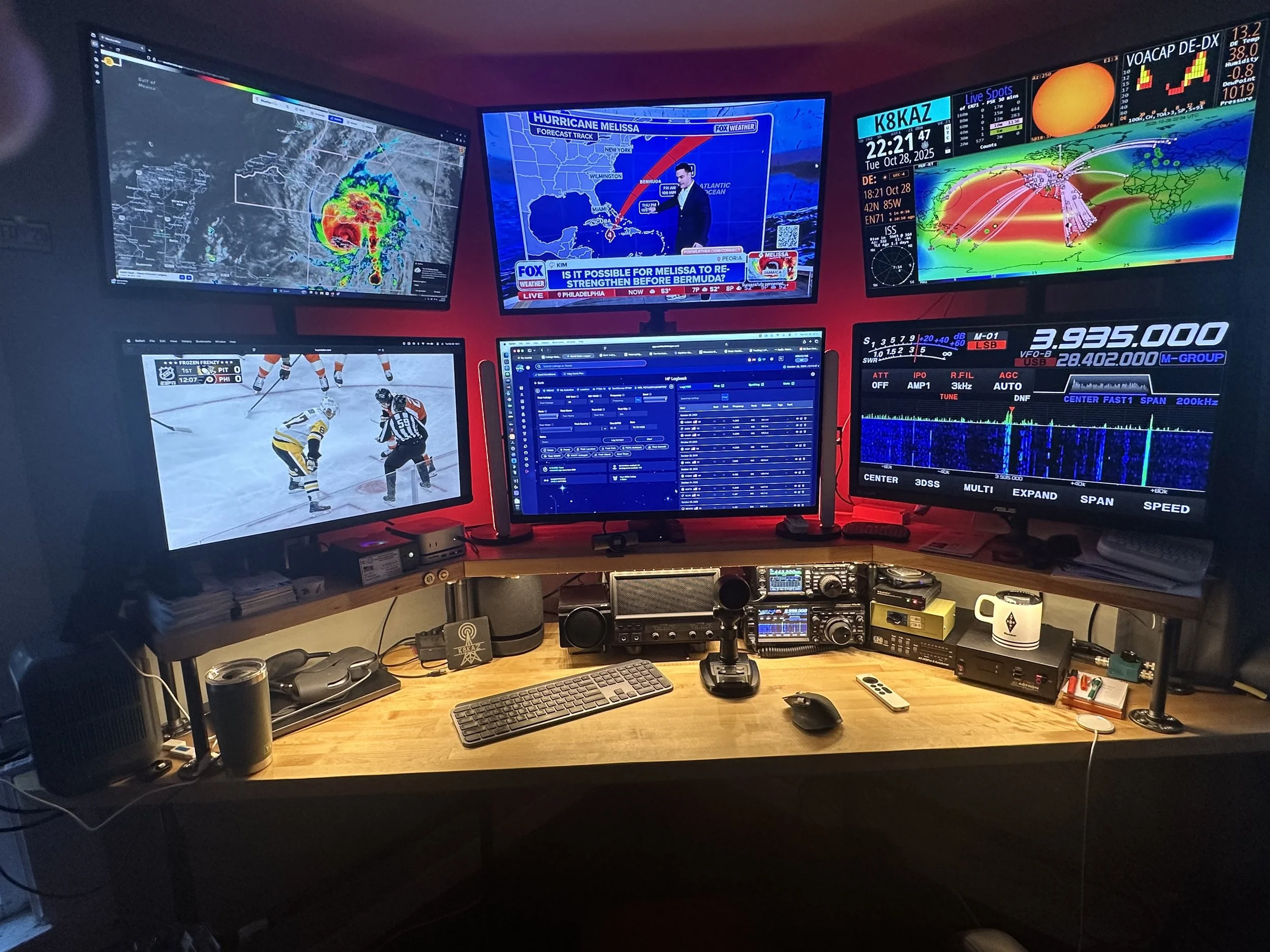 Running a Yaesu FTDX-10 w/ lgd at-200proII auto tuner, Yaesu 991A, Yaesu M100 on a switch for both radios, Yaesu SP9000 speaker, Logitech Keyboard, mouse, and lighting, led strip under the shelf to light it all up. Phase 2 is coming, hopefully this summer. 40’ fold-over ROHN tower with a VEQ Hex antenna and a 1500w amp. Need to save up a bit for phase 2.