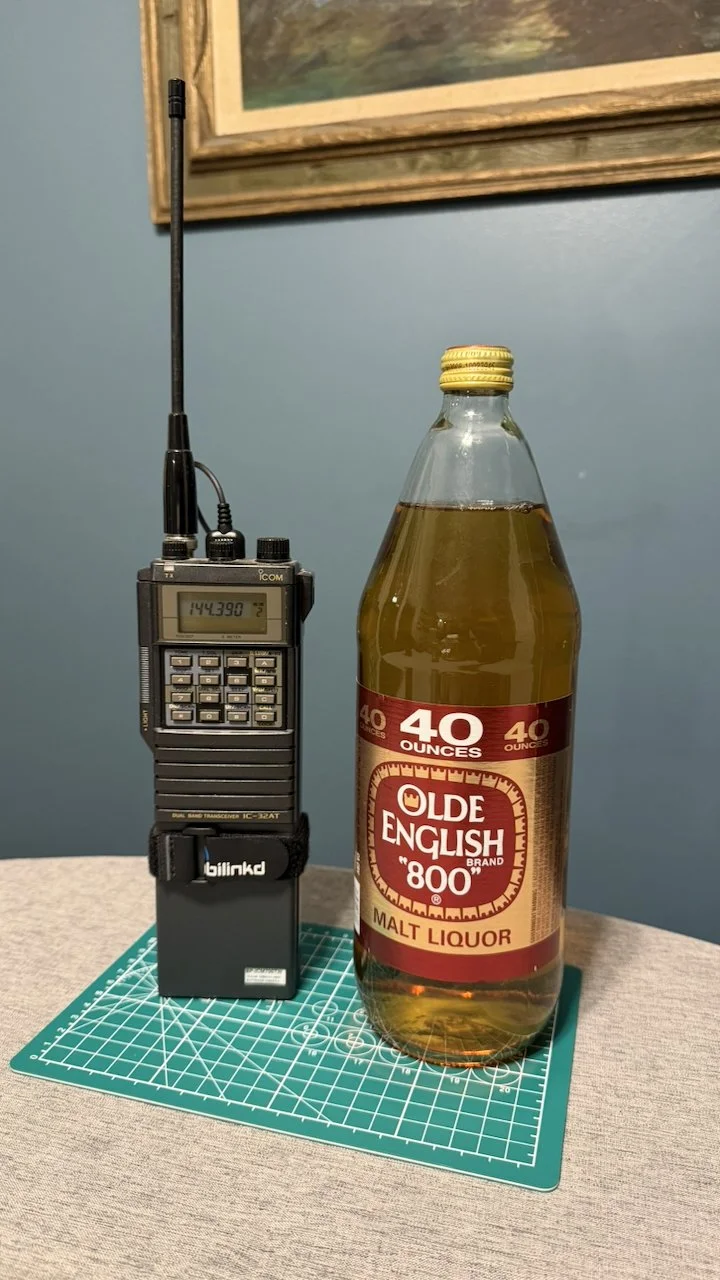 ICOM IC-32AT dual band (2m/70cm) and full duplex HT (5W), with ICOM FA-1443B antenna and Mobilinkd TNC4. Battery had been replaced. Olde English 800 malt liquor (40oz) for size comparison.